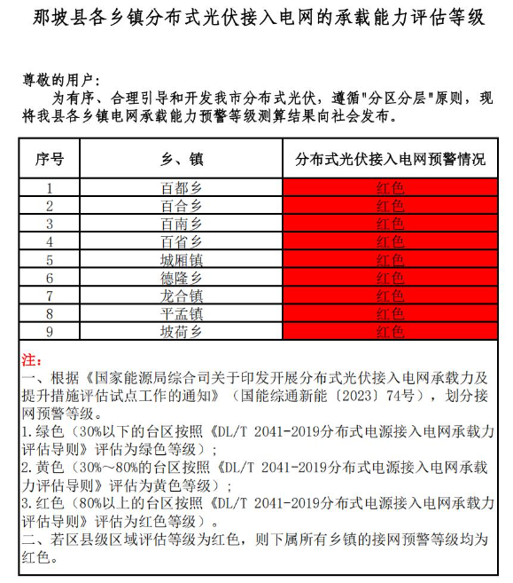 3月18日,廣西百色市發(fā)改委發(fā)布通知,就12個(gè)縣市2025年第一季度電網(wǎng)承載能力預(yù)警等級(jí)進(jìn)行公告。通知顯示,百色轄區(qū)內(nèi)預(yù)警等級(jí)為紅色的供電區(qū)域?yàn)?5個(gè)、預(yù)警等級(jí)黃色供電區(qū)域?yàn)?個(gè)、預(yù)警等級(jí)綠色供電區(qū)域?yàn)?個(gè)。 通知主要內(nèi)容如下: 為貫徹落實(shí)國(guó)家、自治區(qū)優(yōu)化營(yíng)商環(huán)境有關(guān)決策部署,推進(jìn)優(yōu)化營(yíng)商環(huán)境提質(zhì)增效,促進(jìn)分布式光伏高效消納,助力分布式光伏市場(chǎng)健康有序發(fā)展。根據(jù)《國(guó)家能源局綜合司關(guān)于印發(fā)開(kāi)展分布式光伏接入電網(wǎng)承載力及提升措施評(píng)估試點(diǎn)工作的通知》(國(guó)能綜通新能〔2023〕74號(hào))、DLT2041-2019分布式電源接入電網(wǎng)承載力評(píng)估導(dǎo)則,我委組織百色供電局、百色能源集團(tuán)對(duì)本企業(yè)營(yíng)業(yè)區(qū)內(nèi)縣(市、區(qū))電網(wǎng)接納分布式光伏能力進(jìn)行承載力評(píng)估,測(cè)算我市各縣(市、區(qū))、開(kāi)發(fā)區(qū)電網(wǎng)承載能力預(yù)警等級(jí),分為綠色、黃色、紅色三個(gè)等級(jí)。 現(xiàn)我委將2025年第一季度各縣(市、區(qū))分布式光伏接入電網(wǎng)的承載能力評(píng)估等級(jí)結(jié)果向社會(huì)發(fā)布。請(qǐng)各分布式光伏開(kāi)發(fā)建設(shè)企業(yè)在投資分布式光伏項(xiàng)目前,充分結(jié)合投資區(qū)域電網(wǎng)承載能力預(yù)警等級(jí)測(cè)算結(jié)果進(jìn)行評(píng)估,避免因電網(wǎng)承載能力受限導(dǎo)致項(xiàng)目無(wú)法按期并網(wǎng)。 百色市各區(qū)縣分布式光伏接入電網(wǎng)的承載能力評(píng)估等級(jí)(2025年第一季度): ![]() 2.田陽(yáng)區(qū)各鄉(xiāng)鎮(zhèn)分布式光伏接入電網(wǎng)的承載能力評(píng)估等級(jí)(2025年第一季度) ![]() 3.田東縣各鄉(xiāng)鎮(zhèn)分布式光伏接入電網(wǎng)的承載能力評(píng)估等級(jí)(2025年第一季度) ![]() 4.平果市各鄉(xiāng)鎮(zhèn)分布式光伏接入電網(wǎng)的承載能力評(píng)估等級(jí)(2025年第一季度) ![]() 5.凌云縣各鄉(xiāng)鎮(zhèn)分布式光伏接入電網(wǎng)的承載能力評(píng)估等級(jí)(2025年第一季度) ![]() 6.樂(lè)業(yè)縣各鄉(xiāng)鎮(zhèn)分布式光伏接入電網(wǎng)的承載能力評(píng)估等級(jí)(2025年第一季度) ![]() 7.靖西市各鄉(xiāng)鎮(zhèn)分布式光伏接入電網(wǎng)的承載能力評(píng)估等級(jí)(2025年第一季度) ![]() 8.那坡縣各鄉(xiāng)鎮(zhèn)分布式光伏接入電網(wǎng)的承載能力評(píng)估等級(jí)(2025年第一季度) ![]() 9.隆林各族自治縣各鄉(xiāng)鎮(zhèn)分布式光伏接入電網(wǎng)的承載能力評(píng)估等級(jí)(2025年第一季度) ![]() 10.田林縣各鄉(xiāng)鎮(zhèn)分布式光伏接入電網(wǎng)的承載能力評(píng)估等級(jí)(2025年第一季度) ![]() 11.西林縣各鄉(xiāng)鎮(zhèn)分布式光伏接入電網(wǎng)的承載能力評(píng)估等級(jí)(2025年第一季度) ![]() 12.德?h各鄉(xiāng)鎮(zhèn)分布式光伏接入電網(wǎng)的承載能力評(píng)估等級(jí)(2025年第一季度) ![]() 13.右江區(qū)各鄉(xiāng)鎮(zhèn)分布式光伏接入電網(wǎng)的承載能力評(píng)估等級(jí)(2025年第一季度) ![]() |