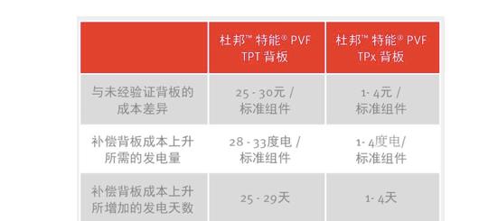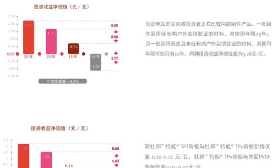 知名組件廠商曾有意在青海投資建設(shè)20MW光伏電站,其技術(shù)總監(jiān)為此事實(shí)地探訪杜邦并發(fā)現(xiàn),基于杜邦™邦特能® PVF薄膜的背板TPx(如TPE,Tedlar®/Polyester/粘接層),與大多數(shù)未經(jīng)驗(yàn)證背板的成本差異是每塊組件1-4人民幣,為了補(bǔ)償這部分成本的上升,大致只需要每塊組件多發(fā)1-4天的電;诙虐™特能® PVF薄膜的TPT (Tedlar®/Polyester/Tedlar®)背板,與大多數(shù)未經(jīng)驗(yàn)證背板的成本差異是每塊組件25-30人民幣,為了補(bǔ)償這部分成本的上升,大致只需要每塊組件多發(fā)25-29天的電。如果組件壽命延長(zhǎng)5年左右,相當(dāng)于1825天的發(fā)電增量。