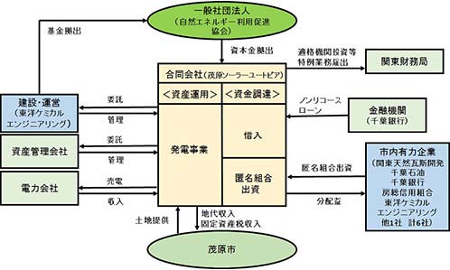 發(fā)電業(yè)務(wù)的主體為SPC(特殊目的公司)——有限責(zé)任公司茂原Solar Utopia。當(dāng)?shù)?家實力企業(yè)以“匿名組合出資”的形式對其出了資。不足部分由千葉銀行的無追索權(quán)貸款提供。