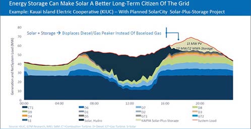 圖4:在KIUC目前的單日電力需求負(fù)荷(紅線)和電源構(gòu)成中加入正在規(guī)劃的蓄電池并設(shè)