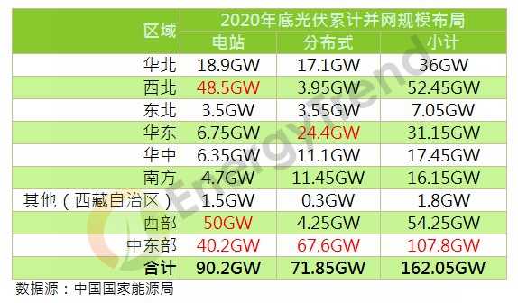 而70GW分布式光伏建設(shè),《意見(jiàn)稿》中也指出各地區(qū)到2020年的規(guī)模布局,如下:
