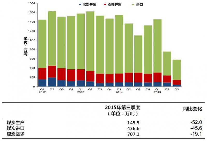 英國2015年第三季度當(dāng)前能源數(shù)據(jù)顯示,煤炭產(chǎn)量為150萬噸油當(dāng)量,同比降低52%,創(chuàng)歷史新低。這主要是由于火力發(fā)電的需求減少以及一些可供開采的煤礦資源殆盡。