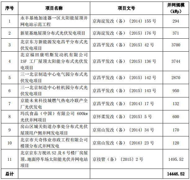 根據(jù)《市發(fā)展改革委關(guān)于印發(fā)<北京市分布式光伏發(fā)電項目管理暫行辦法>的通知》(京發(fā)改規(guī)〔2014〕4號)和《市財政局市發(fā)展改革委關(guān)于印發(fā)<北京市分布式光伏發(fā)電獎勵資金管理辦法>的通知》(京財經(jīng)一〔2015〕1533號)要求,現(xiàn)對擬納入《北京市分布式光伏項目獎勵名單(第二批)》的分布式光伏發(fā)電項目進行公示。