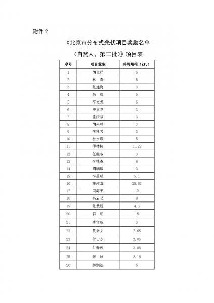 根據(jù)《市發(fā)展改革委關(guān)于印發(fā)<北京市分布式光伏發(fā)電項目管理暫行辦法>的通知》(京發(fā)改規(guī)〔2014〕4號)和《市財政局市發(fā)展改革委關(guān)于印發(fā)<北京市分布式光伏發(fā)電獎勵資金管理辦法>的通知》(京財經(jīng)一〔2015〕1533號)要求,現(xiàn)對擬納入《北京市分布式光伏項目獎勵名單(第二批)》的分布式光伏發(fā)電項目進(jìn)行公示。