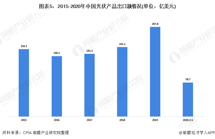 2020年1-5月,我國光伏組件出口市場中,歐洲占比進一步增大為40%,成為最大出口區(qū)域。而美國時隔兩年再次進去前十市場,2020年1-5月,我國對美國出口額為3.1億美元,同比增長20倍以上。
