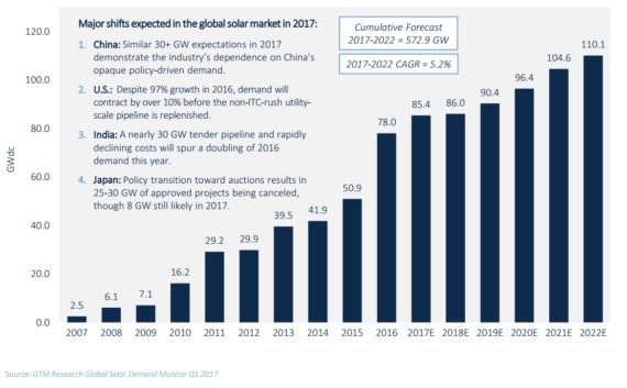 2016年,中國(guó)的太陽能需求達(dá)到34吉瓦新增裝機(jī)量,超過預(yù)期。這導(dǎo)致了全球預(yù)測(cè)的重大變化,分析師們紛紛提高對(duì)未來六年中國(guó)新增裝機(jī)量的預(yù)測(cè),這將反過來影響全球預(yù)期。相比此前預(yù)測(cè)的2017年市場(chǎng)緊縮7%,GTM現(xiàn)在預(yù)測(cè)市場(chǎng)將增長(zhǎng)9.4%。