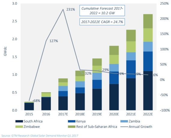 撒哈拉以南非洲對(duì)開發(fā)商展現(xiàn)了10吉瓦的機(jī)會(huì)。2016年,南非、津巴布韋、肯尼亞和納米比亞至少投運(yùn)了10個(gè)公共事業(yè)規(guī)模項(xiàng)目。展望未來,GTM預(yù)計(jì)2017年撒哈拉以南非洲將實(shí)現(xiàn)近1吉瓦的并網(wǎng)容量,并有可能到2022年新增太陽能裝機(jī)量超10吉瓦。