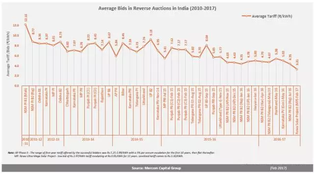 根據(jù)Mercom整理的數(shù)據(jù),2010年到2017年印度光伏項目競標(biāo)報價下跌了73%。2010年10月份150兆瓦項目競標(biāo)報價為12.16盧比(17美分)/千瓦時,到2016年1月已經(jīng)跌至4.35盧比(7美分)/千瓦時,而2017年最近一次競標(biāo)的報價已經(jīng)低至2.44盧比(4美分)/千瓦時。