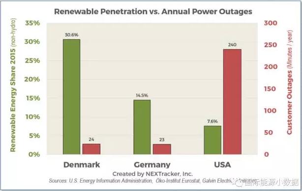 如圖示,德國(guó)風(fēng)電、光伏發(fā)電比例達(dá)14.5%,但是用戶(hù)年平均斷電僅23分鐘;而美國(guó)的風(fēng)電、光伏比例僅為7.6%,但是用戶(hù)年平均斷電達(dá)240分鐘。在丹麥,間歇性可再生能源比例高達(dá)30.6%,用戶(hù)年平均斷電僅為24分鐘。