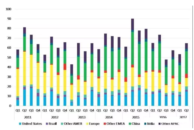 總體而言,2017年第2季度全球可再生能源投資總額為648億美元,比2016年第二季度下降了12%。具體而言,太陽能投資在這一季度達(dá)到356億美元,比去年同期上升了19%;而風(fēng)電投資只有262億美元,比去年同期下降了29%。