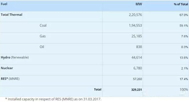 根據(jù)電力部最新發(fā)布的數(shù)據(jù),到2017年6月30日止,印度發(fā)電總裝機達到329.231吉瓦,其中煤電裝機占59.1%、天然氣7.6%、大型水電13.6%、核電2.1%,其他可再生能源(包括小水電、生物質(zhì)發(fā)電、城鄉(xiāng)垃圾發(fā)電、太陽能、風能)占比17.4%。