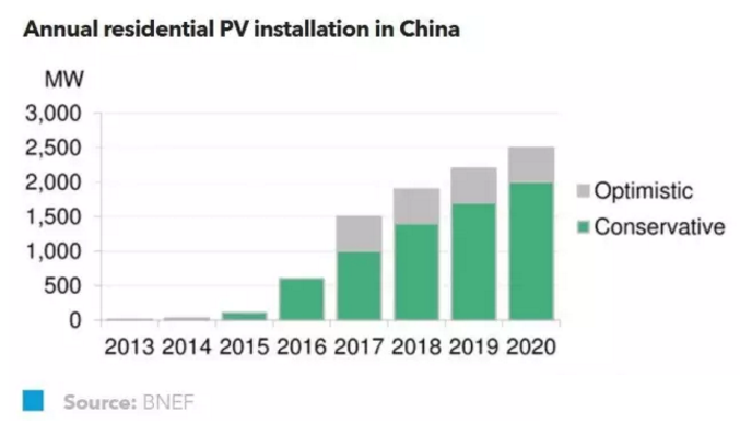 2017年,中國(guó)的戶用光伏新增裝機(jī)容量會(huì)超過(guò)1GW,超過(guò)2016年為止的累計(jì)裝機(jī)容量。BNEF預(yù)測(cè),至2020年,中國(guó)的家庭屋頂光伏累計(jì)裝機(jī)容量將接近10GW,至2040年將超過(guò)100GW。