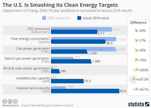 此外,美國可再生能源基礎設施在過去十年內(nèi)的投入要遠超預期速度。目前美國已經(jīng)成風力發(fā)電量已經(jīng)超過預期361%。
