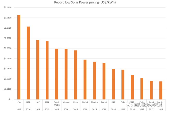 自從2013年美國(guó)光伏項(xiàng)目報(bào)出8.3美分/千瓦時(shí)的最低價(jià)格以來(lái),光伏最低價(jià)不斷被刷新:2014年阿聯(lián)酋項(xiàng)目報(bào)4.97美分/千瓦時(shí);2015年沙特項(xiàng)目報(bào)4.97美分/千瓦時(shí);2016年在沙特再度報(bào)出2.42美分/千瓦時(shí)。到目前為止,2017年在全世界各地的光伏競(jìng)標(biāo)中已經(jīng)有7個(gè)項(xiàng)目的報(bào)價(jià)低于2016年的最低報(bào)價(jià)。有國(guó)際專家預(yù)計(jì),按目前光伏成本趨勢(shì),2019年光伏最低報(bào)價(jià)可低至1美分/千瓦時(shí)。