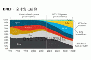 6月20日,彭博新能源財經(jīng)(BNEF)最新發(fā)布的全球電力系統(tǒng)長期分析報告《2018新能源市場長期展望(NEO)》(下稱《報告》)稱,到2050年,光伏和風(fēng)電發(fā)電量將約占全球總發(fā)電量的50%,煤電占比將從目前的38%縮減至11%。