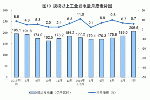 新能源發(fā)電漲跌各異。7月份,風(fēng)電增速加快,核電、太陽(yáng)能發(fā)電增速回落。其中,因主要風(fēng)電地區(qū)風(fēng)況較好,風(fēng)電增速比上月加快13.3個(gè)百分點(diǎn),同比增長(zhǎng)24.7%;核電因上月同期存在機(jī)組檢修,增速較高,本月回落5.1個(gè)百分點(diǎn),同比增長(zhǎng)14.2%;太陽(yáng)能發(fā)電同比增長(zhǎng)10.9%,比上月回落10.2個(gè)百分點(diǎn)。