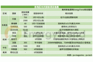 2019年初的海外市場,光伏招標(biāo)項目接踵而至,東南亞、中東、歐洲、南美區(qū)域多點開花。從2019年各區(qū)域已發(fā)布的光伏招標(biāo)相關(guān)信息來看: