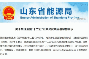 日前,山東能源局發(fā)布《關(guān)于梳理全省“十二五”以來光伏項目信息的公示》:按照國家能源局《關(guān)于梳理“十二五”以來風(fēng)電、光伏發(fā)電項目信息的通知》要求,我局組織各市對本地“十二五”以來光伏項目情況進(jìn)行了梳理。現(xiàn)根據(jù)各地上報的項目情況,對光伏項目進(jìn)行公示,公示時間為2019年3月18日—2019年3月22日。如有異議,可通過電話、郵箱(0531-68627623,snyjxnyc@shandong.cn)等方式進(jìn)行反饋。