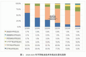 2018年,各種電池技術(shù)平均轉(zhuǎn)換效率方面,規(guī);a(chǎn)的多晶黑硅電池的平均轉(zhuǎn)換效率達(dá)到19.2%,使用PERC電池技術(shù)的單晶和多晶黑硅電池效率提升至21.8%和20.3%,較2017年分別提升0.5個(gè)百分點(diǎn)和0.3個(gè)百分點(diǎn),N型PERT單晶電池平均轉(zhuǎn)換效率已經(jīng)達(dá)到21.5%。雙面N型PERT電池和異質(zhì)結(jié)(HJT)電池已進(jìn)入量產(chǎn),并且會(huì)成為未來(lái)發(fā)展的主要方向之一。下表給出了2018-2025年不同類型電池轉(zhuǎn)換效率變化趨勢(shì)。