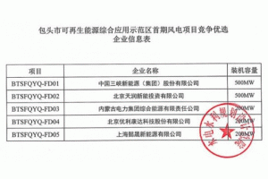內(nèi)蒙古包頭市政府日前發(fā)布《包頭市可再生能源綜合應(yīng)用示范區(qū)首期風(fēng)電項(xiàng)目優(yōu)選結(jié)果公示》,項(xiàng)目裝機(jī)規(guī)模為1600MW。其中三峽新能源(500MW)、天潤新能(500MW)、內(nèi)蒙古電力集團(tuán)綜合能源有限責(zé)任公司(200MW)、優(yōu)利康達(dá)(200MW)、上海懿晟新能源有限公司(200MW)。