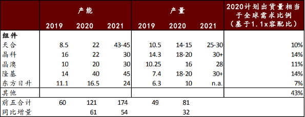 光伏行業(yè)本輪擴(kuò)產(chǎn),集中于龍頭企業(yè),而硅片龍頭隆基股份更是行業(yè)先鋒,其計(jì)劃將組件產(chǎn)能由2019年的14GW擴(kuò)至2021年的45GW。