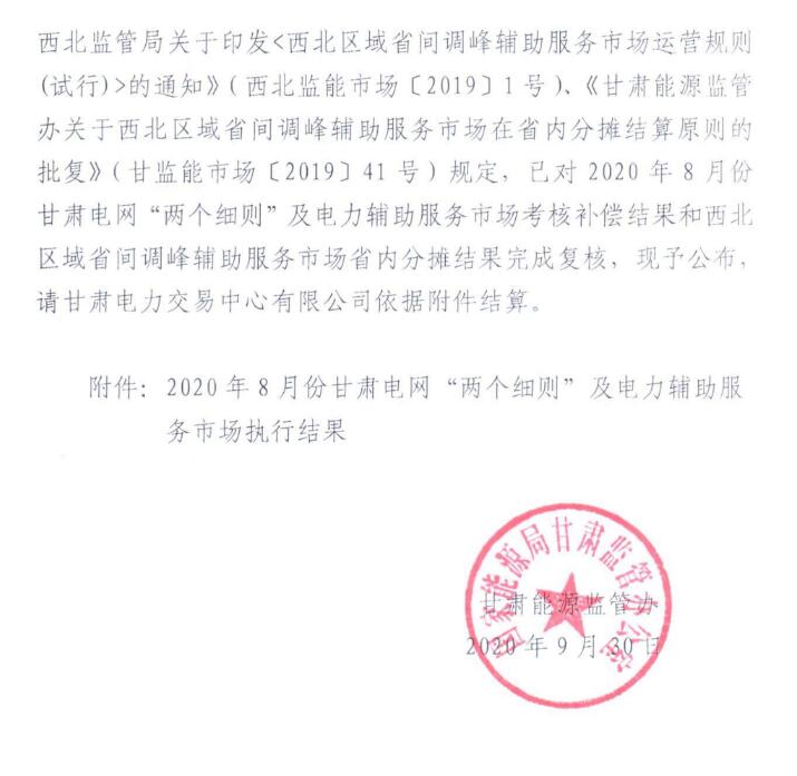 2020年8月份甘肅電網(wǎng)“兩個細則”及電力輔助服務市場執(zhí)行結(jié)果公布