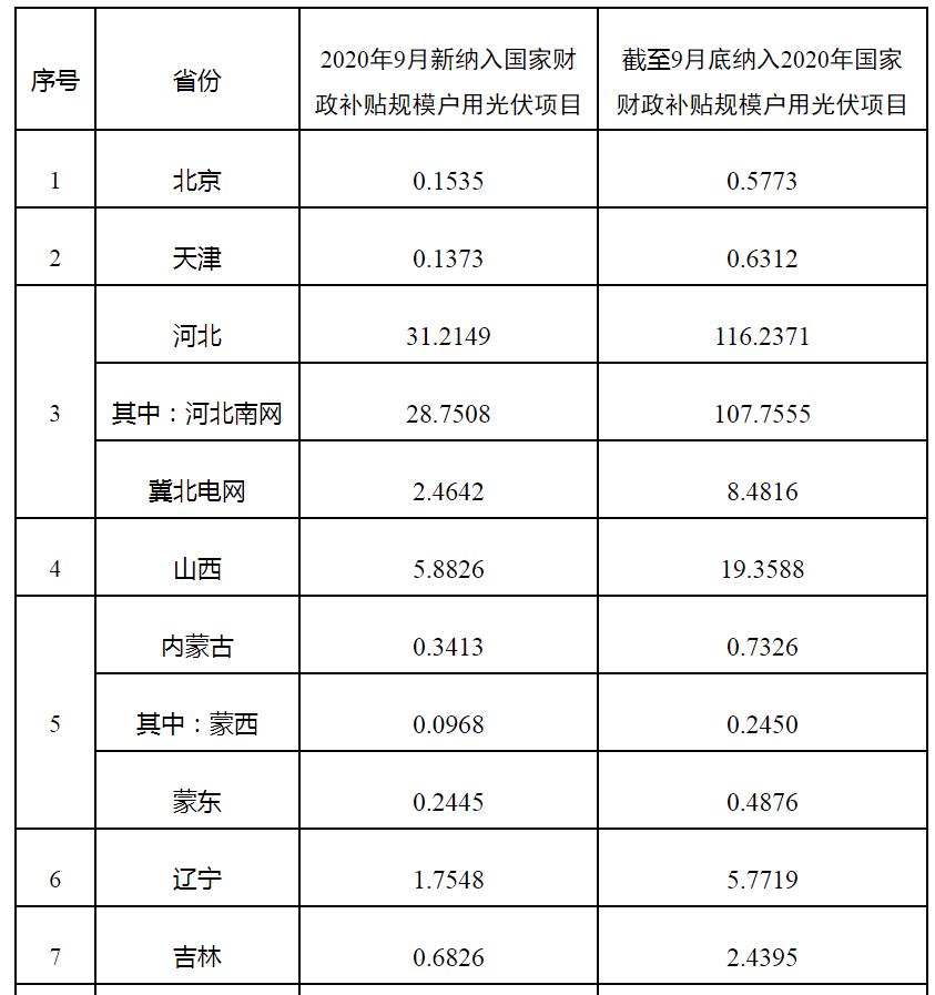 根據(jù)各省級(jí)能源主管部門、電網(wǎng)企業(yè)報(bào)送信息,經(jīng)國(guó)家可再生能源信息管理中心梳理統(tǒng)計(jì),2020年9月新納入國(guó)家財(cái)政補(bǔ)貼規(guī)模戶用光伏項(xiàng)目總裝機(jī)容量為130.1萬(wàn)千瓦。截至2020年9月底,全國(guó)累計(jì)納入2020年國(guó)家財(cái)政補(bǔ)貼規(guī)模戶用光伏項(xiàng)目裝機(jī)容量為527.4萬(wàn)千瓦。詳細(xì)情況見附表。