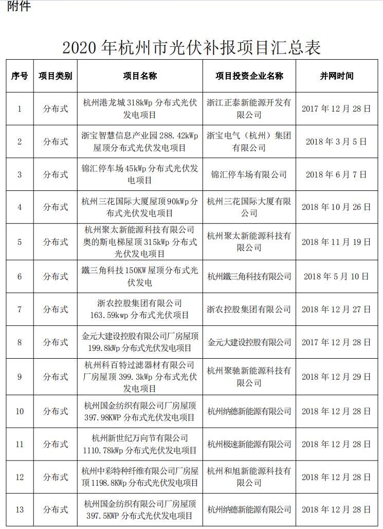 10月22日,杭州市經濟和信息化局發(fā)布《關于2020年杭州市光伏補報項目的公示》,共涉及103個光伏項目,公示日期:2020年10月23日至10月29日。