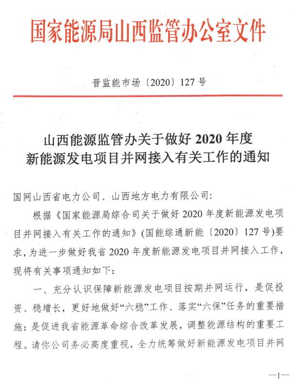從山西能源監(jiān)管辦了解到:山西能源監(jiān)管辦日前印發(fā)《關(guān)于做好2020年度新能源發(fā)電項目并網(wǎng)接入有關(guān)工作的通知》,要求按照“能并盡并”原則,對于具備全部或部分容量并網(wǎng)條件的新能源發(fā)電項目,采取切實有效措施,全力統(tǒng)籌做好新能源發(fā)電項目并網(wǎng)接入工作,確保按期并網(wǎng)。