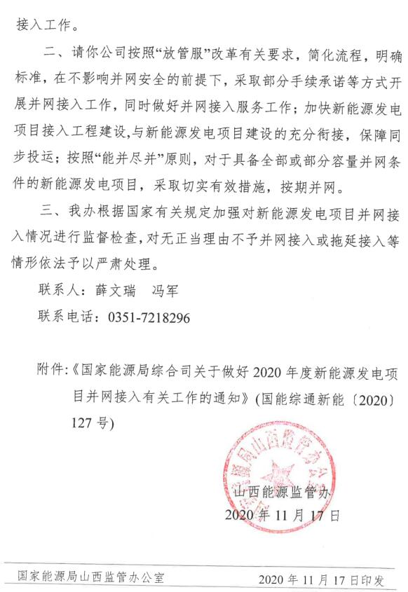 從山西能源監(jiān)管辦了解到:山西能源監(jiān)管辦日前印發(fā)《關(guān)于做好2020年度新能源發(fā)電項目并網(wǎng)接入有關(guān)工作的通知》,要求按照“能并盡并”原則,對于具備全部或部分容量并網(wǎng)條件的新能源發(fā)電項目,采取切實有效措施,全力統(tǒng)籌做好新能源發(fā)電項目并網(wǎng)接入工作,確保按期并網(wǎng)。年底前新能源發(fā)電項目并網(wǎng)需求較大,并網(wǎng)時段較為集中,《通知