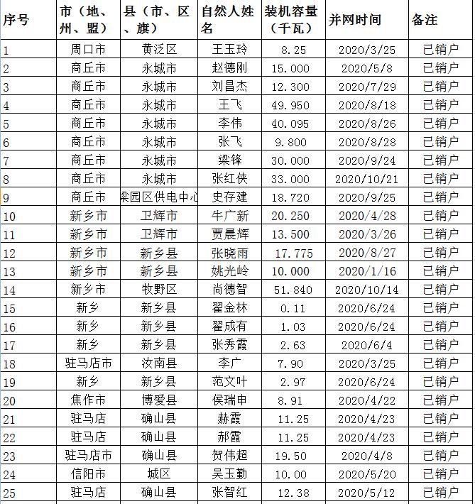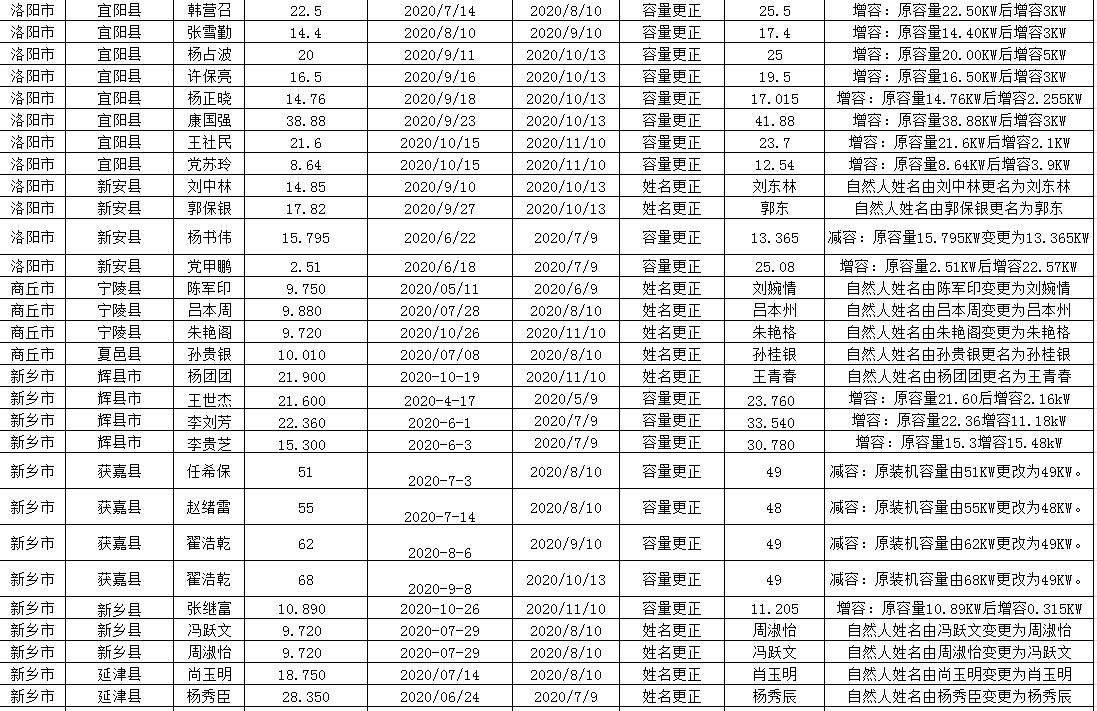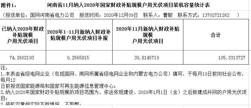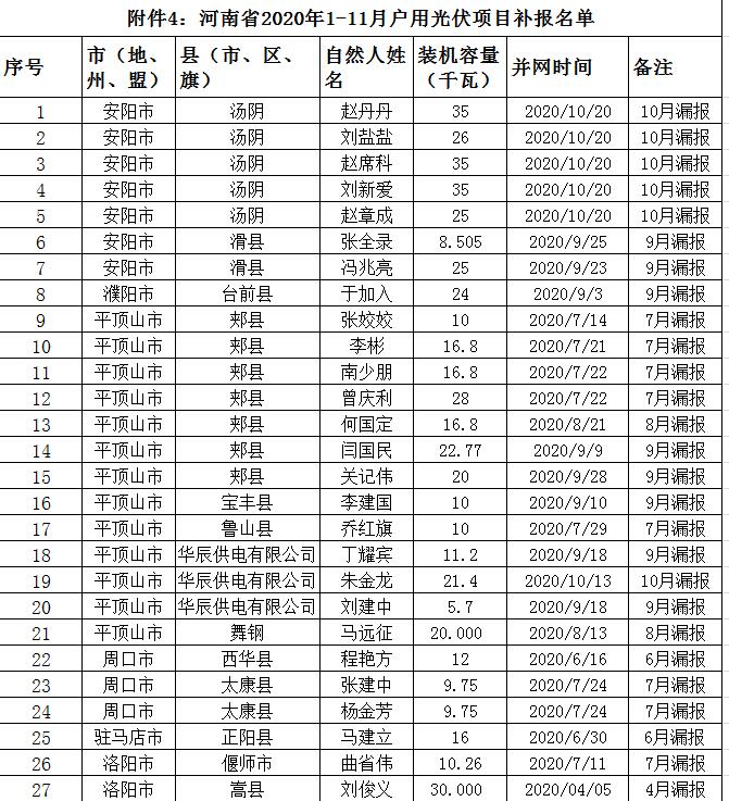 按照國家能源局相關(guān)要求,現(xiàn)對河南省2020年11月已建成并網(wǎng)但未納入國家補貼范圍的戶用光伏項目信息及2020年1-11月份并網(wǎng)戶用光伏變更信息予以公示。公示期為2020年12月10日-12月12日,如有異議,請在公示期結(jié)束前向國網(wǎng)河南省電力公司營銷部提出。件1:河南省11月納入2020年國家財政補貼規(guī)模戶用光伏項目裝機容量統(tǒng)