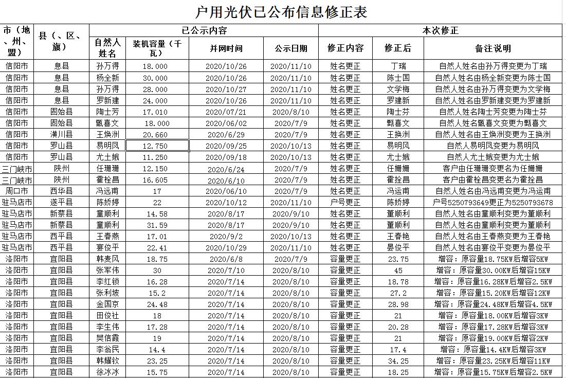 按照國家能源局相關(guān)要求,現(xiàn)對河南省2020年11月已建成并網(wǎng)但未納入國家補貼范圍的戶用光伏項目信息及2020年1-11月份并網(wǎng)戶用光伏變更信息予以公示。公示期為2020年12月10日-12月12日,如有異議,請在公示期結(jié)束前向國網(wǎng)河南省電力公司營銷部提出。