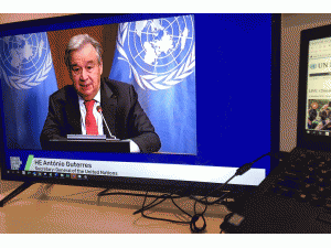 聯(lián)合國秘書長古特雷斯通過線上方式在“2020氣候雄心峰會”上致辭。