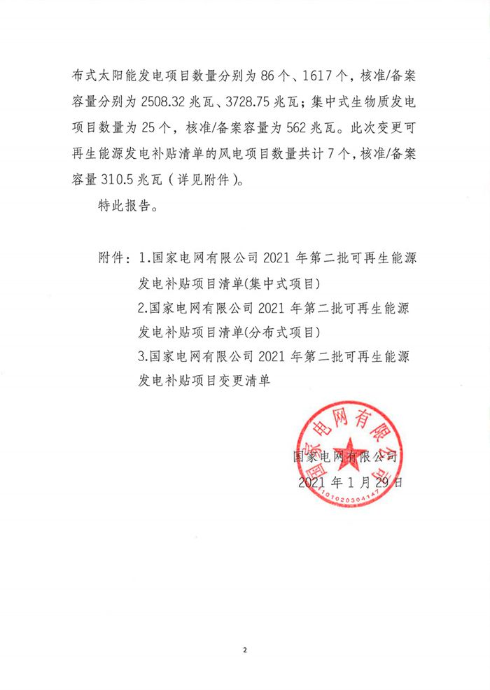 2021年1月31日,國(guó)家電網(wǎng)公布2021年第二批可再生能源發(fā)電補(bǔ)貼項(xiàng)目清單。此次納入2021年第二批可再生能源發(fā)電補(bǔ)貼清單的項(xiàng)目共計(jì)1765個(gè),核準(zhǔn)/備案容量9861.77MW。