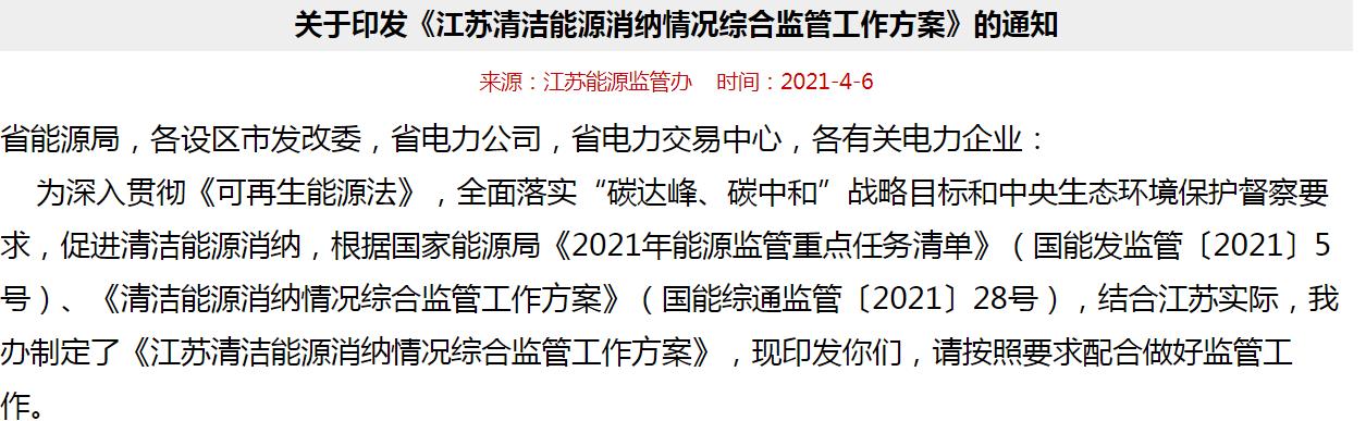 江蘇清潔能源消納情況綜合監(jiān)管工作方案