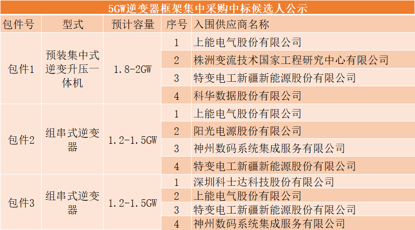 5月22日-23日,中核匯能2021年5GW光伏組件設(shè)備第二次框架集中采購(gòu)與中核匯能2021年度第一次5GW逆變器框架集中采購(gòu)公示中標(biāo)候選人。據(jù)光伏們了解,中核匯能本次的組件和逆變器中標(biāo)是入圍標(biāo),未來(lái)項(xiàng)目的供貨規(guī)模會(huì)根據(jù)所有中標(biāo)候選企業(yè)協(xié)商而定。以下5GW組件、逆變器各包件中標(biāo)候選人公示信息: