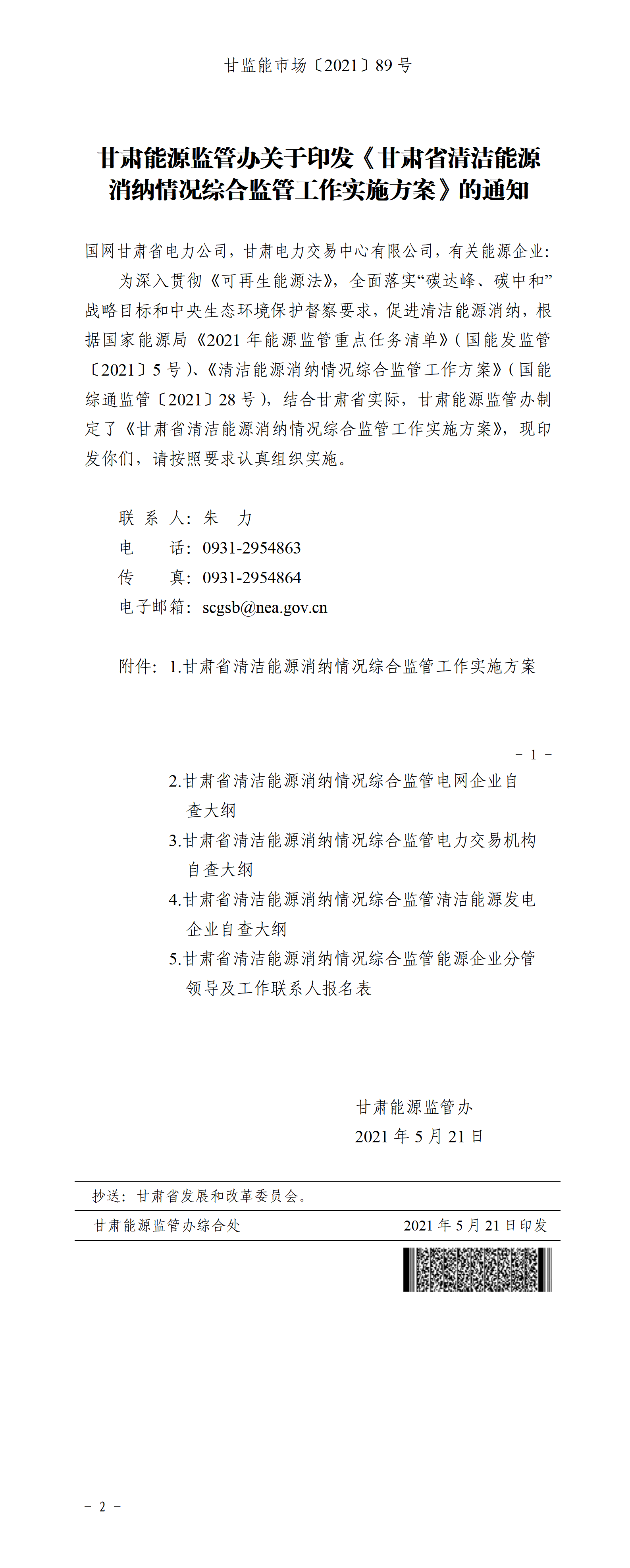 甘肅省清潔能源消納情況綜合監(jiān)管工作實(shí)施方案為深入貫徹《可再生能源法》,全面落實(shí)“碳達(dá)峰、碳中和”戰(zhàn)略目標(biāo)和中央生態(tài)環(huán)境保護(hù)督察要求,促進(jìn)清潔能源消納,根據(jù)《2021年能源監(jiān)管重點(diǎn)任務(wù)清單》(國能發(fā)監(jiān)管〔2021〕5號(hào))、《清潔能源消納情況綜合監(jiān)管工作方案》(國能綜通監(jiān)管〔2021〕28號(hào))安排,結(jié)合甘肅實(shí)際,