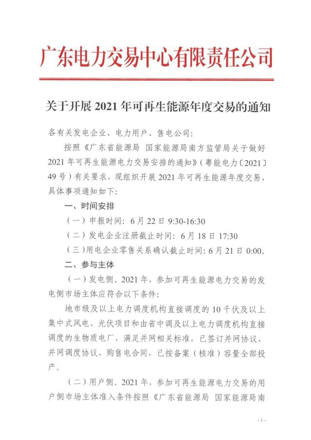 日前,廣東電力交易中心發(fā)布關(guān)于開展2021年可再生能源年度交易的通知,6月只開展可再生能源年度交易,不開展可再生能源7月月度交易。申報(bào)時(shí)間為6月22日。
