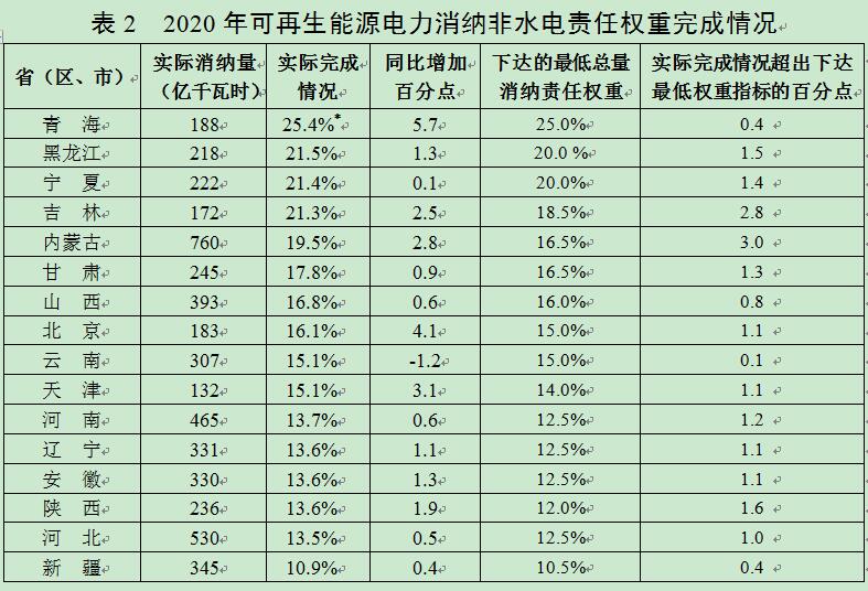 根據(jù)《國家發(fā)展改革委 國家能源局關于印發(fā)各省級行政區(qū)域2020年可再生能源電力消納責任權(quán)重的通知》(發(fā)改能源〔2020〕767號)公布的2020年各省(區(qū)、市)可再生能源電力消納責任權(quán)重,綜合考慮各省本地生產(chǎn)、本地利用以及外來電力消納情況,經(jīng)核算,除西藏免除考核外,全國30個省(區(qū)、市)都完成了國家能源主管部門下達的總量消納責任權(quán)重和非水電消納責任權(quán)重。