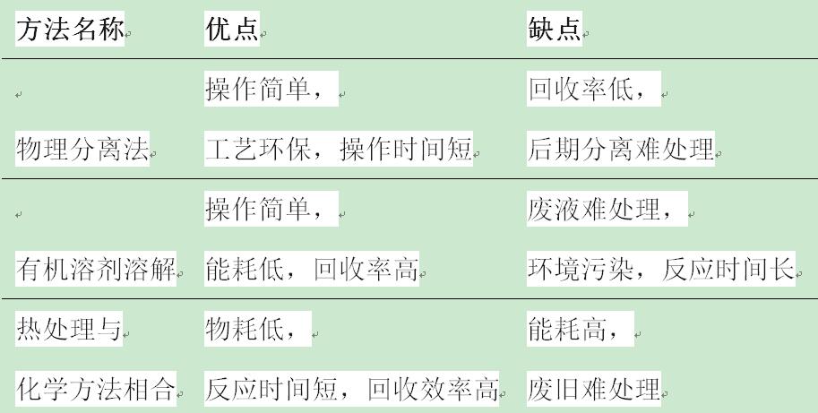 由上表可以看出,物理分離方法操作簡(jiǎn)單、工藝環(huán)保,但是該方法回收率低且后期分離難處理;有機(jī)溶劑溶解法雖然操作簡(jiǎn)單、能耗低、回收率高,但是在回收過程中產(chǎn)生的廢液難以處理,如果處理不當(dāng)容易導(dǎo)致環(huán)境污染;熱處理與化學(xué)方法相結(jié)合的方法物耗低、反應(yīng)時(shí)間短、回收效率高,但是也存在廢舊物難處理的問題。