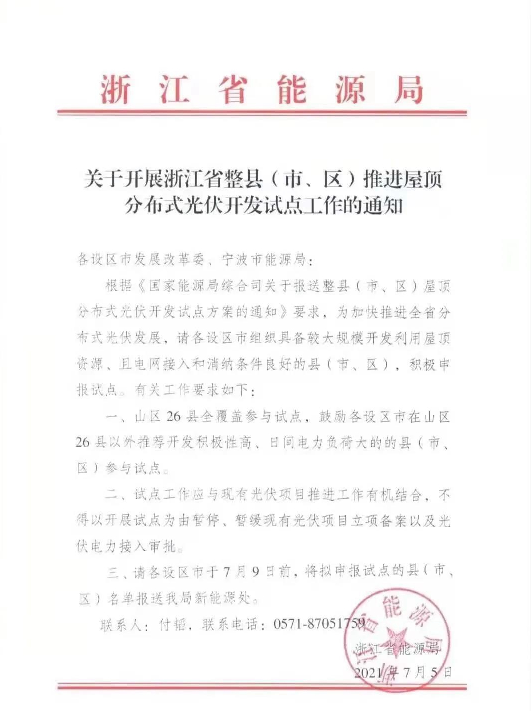 浙江:不得以試點(diǎn)為由暫停、暫緩現(xiàn)有光伏項(xiàng)目立項(xiàng)備案及接入審批!
