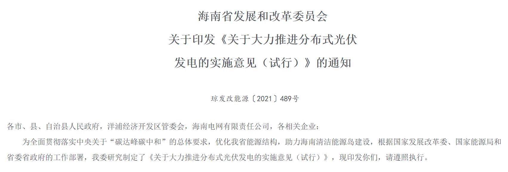 從海南省發(fā)改委官網(wǎng)獲悉:為全面貫徹落實(shí)中央關(guān)于“碳達(dá)峰碳中和”的總體要求,優(yōu)化海南省能源結(jié)構(gòu),助力海南清潔能源島建設(shè),海南省發(fā)改委研究制定了《關(guān)于大力推進(jìn)分布式光伏發(fā)電的實(shí)施意見(jiàn)(試行)》,明確提出:積極開(kāi)展多種形式分布式光伏發(fā)電應(yīng)用,鼓勵(lì)多場(chǎng)景分布式光伏發(fā)電應(yīng)用,推動(dòng)政府投資新建建筑開(kāi)展分布式光伏發(fā)