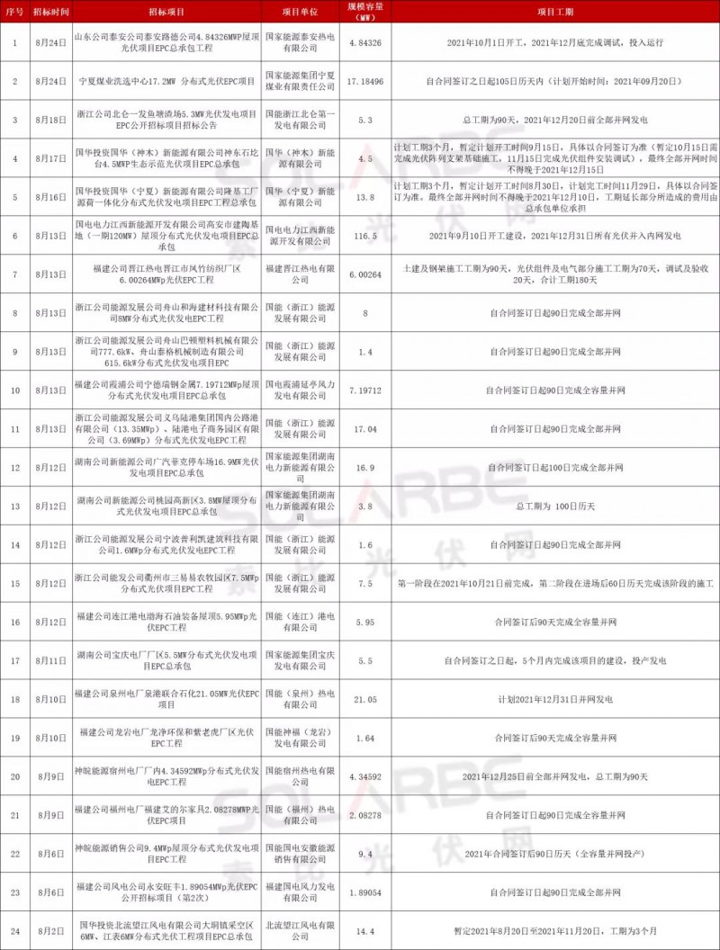 據(jù)索比光伏網(wǎng)統(tǒng)計(jì),國(guó)家能源集團(tuán)在8月份發(fā)布了24個(gè)分布式光伏項(xiàng)目EPC招標(biāo),裝機(jī)容量合計(jì)300MW,大多要求年底前并網(wǎng)。