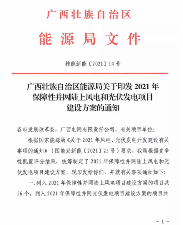 8月27日,廣西省能源局印發(fā)《關(guān)于2021年保障性并網(wǎng)陸上風(fēng)電和光伏發(fā)電項(xiàng)目建設(shè)方案的通知》。