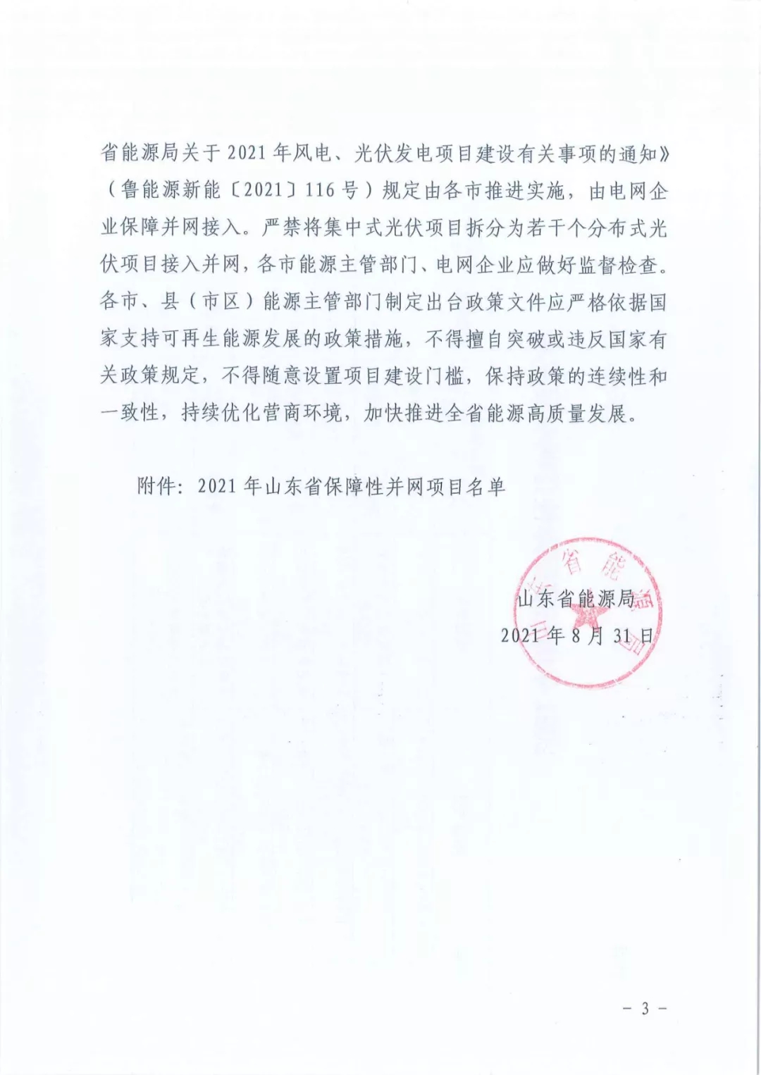 8月31日,山東省能源局下發(fā)《關(guān)于下達(dá)2021年保障性并網(wǎng)項(xiàng)目名單的通知》,公布了110個(gè)納入2021年保障性規(guī)模的項(xiàng)目,總規(guī)模約為544萬(wàn)千瓦。其中,光伏項(xiàng)目51個(gè),總規(guī)模約為236萬(wàn)千瓦;風(fēng)電項(xiàng)目59個(gè),總規(guī)模約為308萬(wàn)千瓦。
