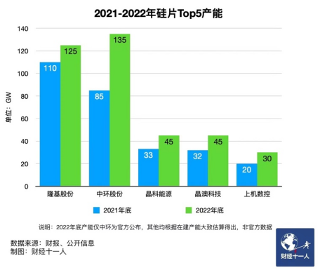 中國光伏行業(yè)協(xié)會硅業(yè)分會根據(jù)各主要企業(yè)的規(guī)劃進行初步統(tǒng)計,2022年底,國內(nèi)多晶硅產(chǎn)能為85萬噸/年,考慮到海外產(chǎn)能供應,可滿足230GW的裝機需求。據(jù)《財經(jīng)》記者不完全統(tǒng)計與推算,2022年底僅Top5硅片企業(yè)就將新增約100GW產(chǎn)能,硅片總產(chǎn)能近500GW。