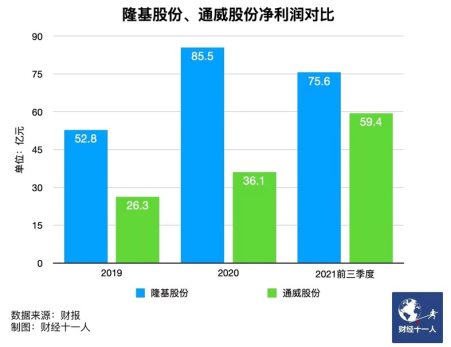 如果說隆基是因為抓住了單晶的超額利潤才成為光伏老大,那么通威股份(44.960, 2.86, 6.79%)(600438.SH)眼下也趕上了硅料的超額利潤期,盡管持續(xù)時間可能并不長。2021年,得益于硅料的高價,通威迅速拉近與隆基的凈利潤差距。2022年硅料價格依然較高,通威作為龍頭獲利最大,而隆基的硅片利潤進一步收縮,通威有可能超越隆基,成為最賺錢的光伏公司。