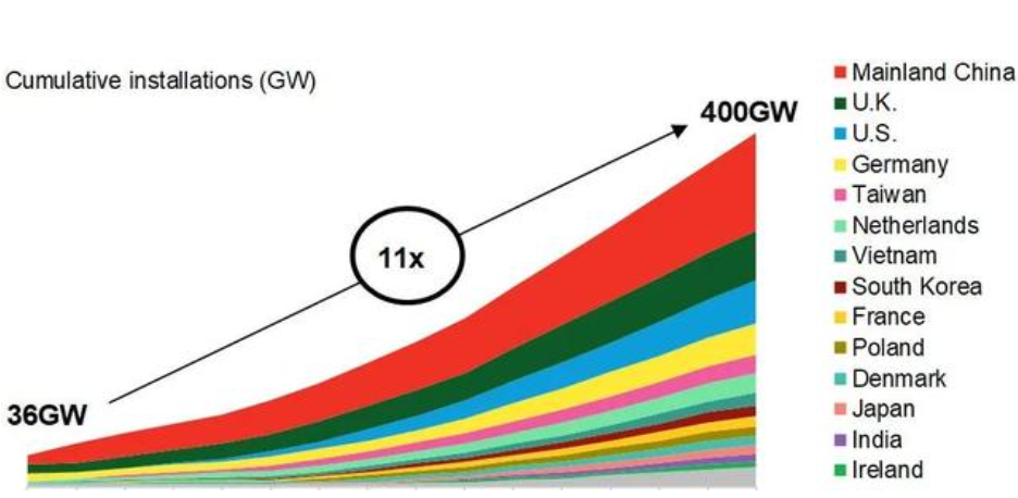 據(jù)彭博新能源預(yù)測,到2035年,全球海上風電累計裝機將到到400GW,和2020年36GW的裝機相比增長11倍。中國大陸、英國、美國、德國、荷蘭將位居前五。(