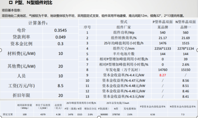 西北勘測設計研究院以西北沙漠、戈壁、荒漠為重點計算對象,預估出不同項目的成本,兼顧環(huán)境、光照等客觀條件變化,從而更直觀對比P型與N型的綜合經(jīng)濟性。就結果來看,N型組件經(jīng)濟性更勝一籌,而且在復雜用地環(huán)境下,更先進的N型技術在支架方案、BOS成本等方面更具經(jīng)濟性優(yōu)勢。
