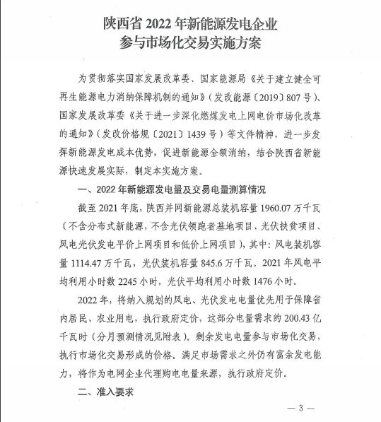 近日,陜西省發(fā)改委發(fā)布《陜西省2022年新能源發(fā)電企業(yè)參與市場(chǎng)化交易實(shí)施方案》。方案指出,2022年新能源參與市場(chǎng)化交易以中長(zhǎng)期為主,交易模式分為:掛牌交易、雙邊協(xié)商交易。方案還指出,截至2021年底,陜西并網(wǎng)新能源總裝機(jī)容量1960.07萬千瓦(不含分布式新能源,不含光伏領(lǐng)跑者基地項(xiàng)目、光伏扶